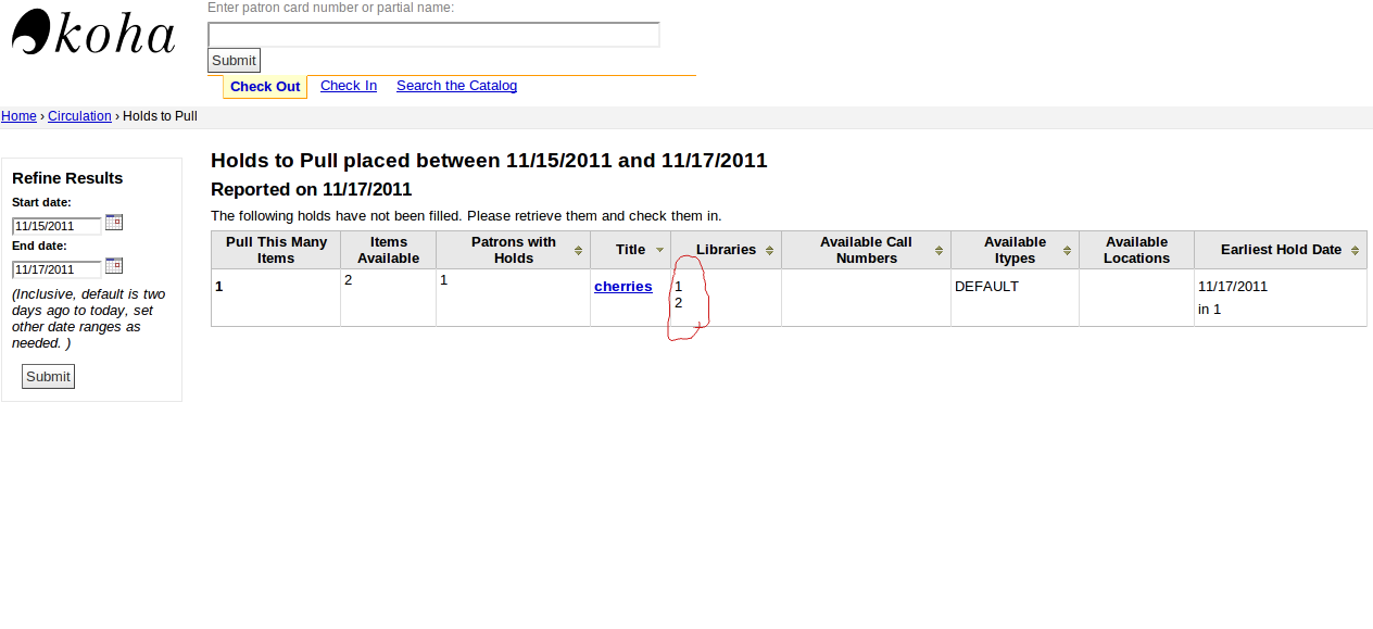 Created attachment 6325 [details] image showing possible bug Hey Nicole Just working on this now, I have attached an image showing what I think you mean. Can you just confirm this is the same issue you were experiencing? For context: there are 3 copies of cherries, 2 copies at branch 1 and 1 copy at branch 2. A user has checked it out from branch 1 and another user has placed a hold on that same copy and asked to collect at branch 2. Hopefully that all made sense. If this isn't the issue, is it possible to get a screenshot showing the issue?