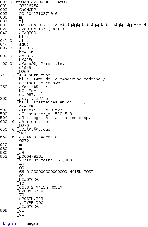 I encountered another encoding problem with this new patch : There are still encoding problems if I try to watch the showmarc details of a record while using the fr-CA language. What's strange is that the encoding is correct in the "en" language. To reproduce : - Have two languages set in your system preferences (I tried with "en" and "fr-CA"). - Go to the showmarc.pl page for a biblio record containing utf-8 characters ( cgi-bin/koha/catalogue/showmarc.pl?id=1 ) - Alternate between the two languages using the language bar at the bottom and see the difference in encoding. For me, the "fr-CA" version of the page had encoding problems and the "en" one was ok.
