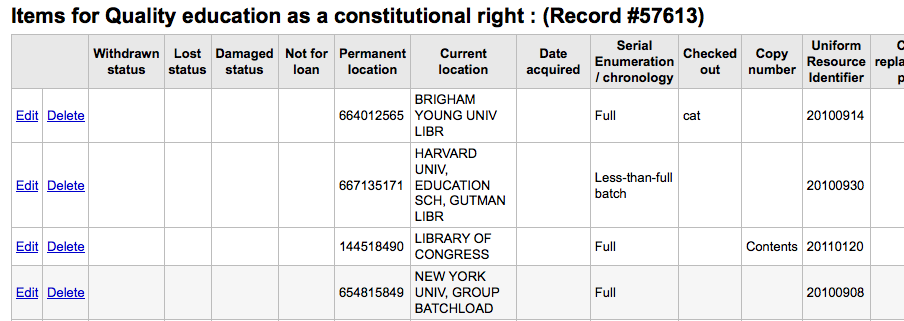 Created attachment 3051 [details] imported from oclc When you search on Z39.50 and use OCLC as your target it brings in 952 fields (aka holdings) from other libraries. Z search should either offer an option (like marc import) or ignore all holdings fields when importing. This can be done with a sys pref and/or an option the Z search form. The discussion on IRC can be read below. [08:58] <nengard> is the z search in acq different from the one in cataloging? I have a report that the acq z search is pulling in 952 fields but i've never seen the cataloging one do that [08:59] <kf> nengard: the forms are differnt - I added some missing options. And you can define a framework- not sure about other differences [09:06] <slef> kf: koha jone or another one? [09:08] <jcamins> nengard: I just realized what it is. [09:08] <jcamins> OCLC. [09:09] <nengard> oh!!!!!!!! [09:09] <jcamins> I remember deleting those fields at Princeton, too. [09:10] <slef> jcamins: always? [09:10] <jcamins> slef: well, we always did at Princeton. [09:10] <jcamins> Maybe some people keep them. [09:10] <slef> jcamins: as in OCLC always send 9xx fields? [09:10] <jcamins> I think so. [09:11] <slef> bleah, I hope that's documented [09:11] * slef browses http://www.oclc.org/ [09:11] <slef> http://www.oclc.org/support/documentation/z3950/search_IRs/#952structure [09:12] <nengard> ICK [09:12] <nengard> but good that it's documented [09:12] <slef> so OCLC users need to configure Koha to use something else? [09:12] <slef> Someone told me why Koha uses 952 but I forget. [09:12] <nengard> i have a theory .... but it's not a nice one :) [09:13] <slef> nengard: what's yours? Mine is 852 => 952 [09:14] <slef> Should koha's z search warn and offer to discard if it sees a biblio/items mapped field in results? [09:14] * Nate_ has quit (Quit: Nate_) [09:14] * tcohen (~tomas@atlas.unc.edu.ar) has joined #koha [09:15] <jcamins> slef: because 952 is used for local holdings by OCLC. [09:15] * Nate_ (~nathancur@c-24-147-25-6.hsd1.ct.comcast.net) has joined #koha [09:16] <nengard> slef the marc import lets you ignore holdings - so i think the z search should too [09:16] <nengard> maybe a sys pref or a checkbox on the z search page (don't import 952) [09:17] <nengard> i'll start a report for this and include the chat
