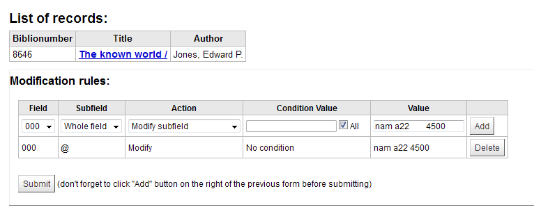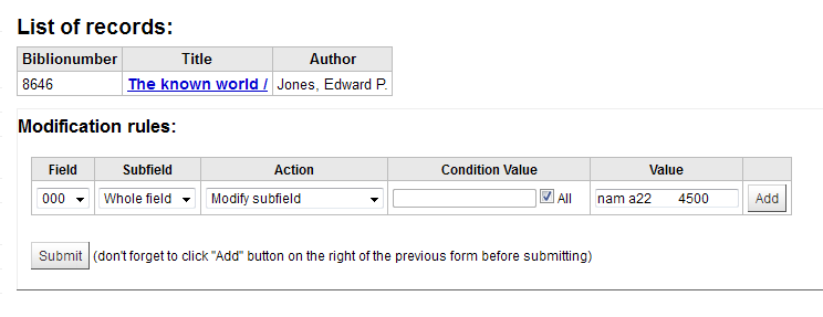 Something I didn't notice before: It doesn't seem you can set indicators. So if I want to create a new 650 tag and add it to a batch of records the resulting addition looks like this: =650 \\$aFiddle tunes When, AFAIK, it should look like this: =650 \0$aDivorced people Also, weren't we going to hide the option to modify 000 since it wasn't working?