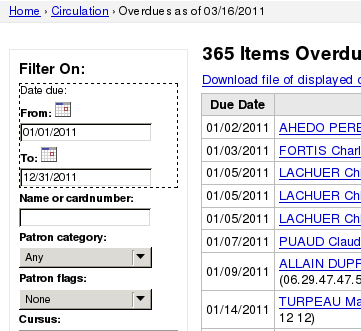 This bug is mentioned in: Bug 5874 : circ/overdue.pl modified : permission & limit on date http://lists.koha-community.org/pipermail/koha-patches/2011-March/014069.html Bug 5874 : circ/overdue.pl modified : permission & limit on date http://lists.koha-community.org/pipermail/koha-patches/2011-March/014088.html