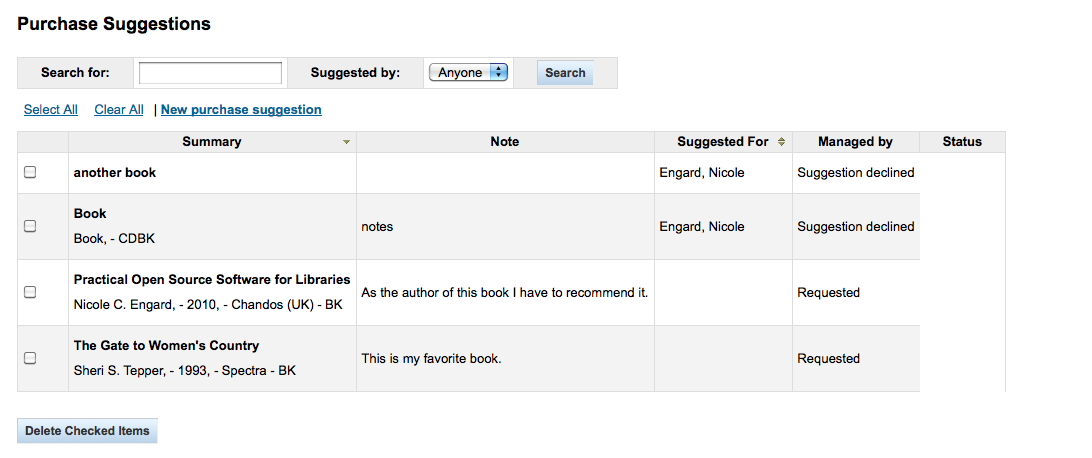 This problem is dependent on having OPACViewOthersSuggestions turned on (the "Suggested For" column does not appear if this option is turned off). The proposed patch works without breaking anything else, so marking as "Passed QA"