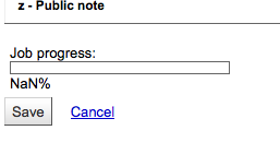 Created attachment 4234 [details] after hitting save on batch modification When you try to use the batch modification tool you get a progress bar that says "NaN%" after saving and you're stuck on the edit form. See attached.
