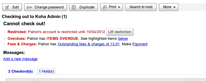 Created attachment 31997 [details] [review] [SIGNED OFF] Bug 643: Allow override of 'debarred' status Add a button to temporarily override patron debarment. To test: 1) Go to patron check out page 2) If patron has been debarred (eg. due to having fees), there is no way to check out to that patron. 3) Apply patch 4) A debarred patron check out page now has a button for "Override debarment temporarily" - clicking on it should allow checking out to that patron. Signed-off-by: Aleisha <aleishaamohia@hotmail.com> Rebased because patch did not apply Signed-off-by: Aleisha <aleishaamohia@hotmail.com> Signed-off-by: Nick Clemens <nick@quecheelibrary.org>