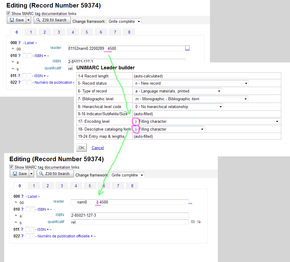 Julian, if I understand things well, what you are referring to has no relation to my patch nor with the problem described by me. The positions you are pointing at (i.e. 100/17-19) are Target Audience Code. According to my knowledge about field 100 (http://archive.ifla.org/VI/3/p1996-1/uni1.htm#100) spaces are not allowed there at all--one should choose from among [a b c d e k m u]. And "if some data in a field is supplied but not all, the omitted data element positions will contain fill characters" which is |. This is why having spaces in 100/17-19 you get | in the plugin, both having my patch applied or not. But if you wanted to see what I am referring to in my patch look at positions 17 and 18 in Unimarc record label for example, where spaces are allowed.