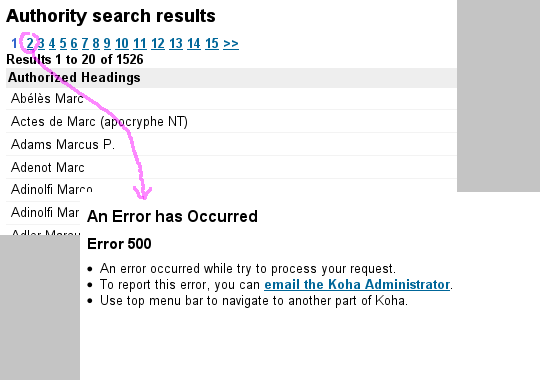 Created attachment 4379 [details] A screenshot illustrating the problem The problem: 1. In OPAC, make an authority search for a common term, to get more than 1 page of results. 2. Try to click 2, 3 etc. You should get an error (cf. attached screenshot). This is because or erroneous T::T prefixing. A patch will follow.