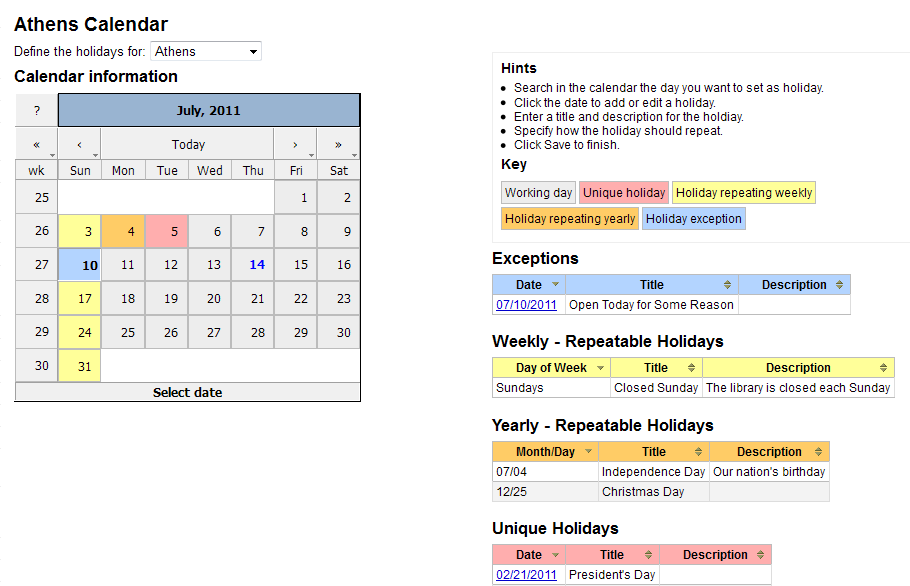 Created attachment 4630 [details] [review] Proposed fix This bug must have been present for a while. There wasn't proper handling of repeating yearly holidays when it came to the label. To be clear, I believe this bug only affected holidays which repeat yearly on the same date. Instead of correcting the label to match the existing scheme I added a new color code and label so that there are now two styles for yearly and weekly repeating holdiays. This makes it more clear what kind of repeating holiday you're looking at (rather than having one color code for both). After applying this patch, new and existing holidays which repeat yearly on the same day should be color-coded orange and have a 'Holiday repeating yearly' label. Weekly holidays are now labeled 'Holiday repeating weekly.'