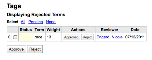 Created attachment 4628 [details] rejected tags showing yellow Tag moderation used to have three colors, yellow for pending, red for rejected, green for approved. They are all yellow now making it impossible to tell on a list of 'all tags' which are approved and which are rejected.