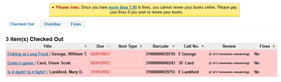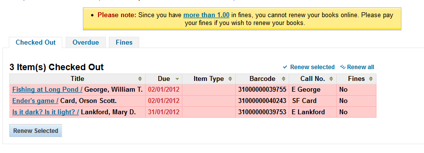 Created attachment 7619 [details] Screenshot showing view without the patch Before this patch the user logged in to the OPAC is correctly told that they cannot renew items online because of their fine, but renewal-related controls are displayed (renew selected, renew all).
