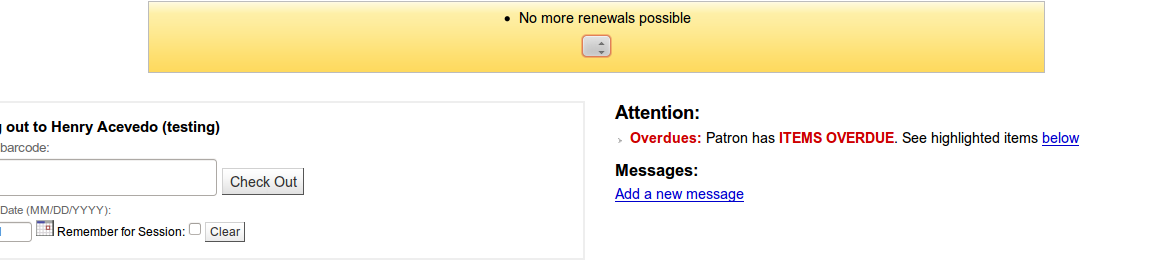 Created attachment 4972 [details] screenshot To reproduce: - check out a book - renew as long as possible - check barcode out again (that's how I ran into it)
