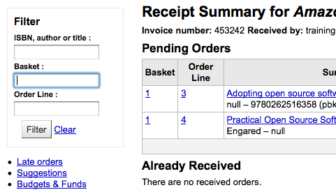 The basket number on the receive items table shows the basket number given by Koha, not the basket number the librarian gave it. The librarian doesn't necessarily know the number Koha assigned and so it should show the number that they chose. The same with the filter on the left - it filters on the basket number assigned by Koha, that's not a number the librarian necessarily knows.