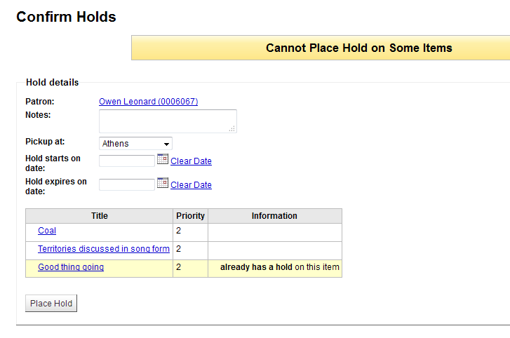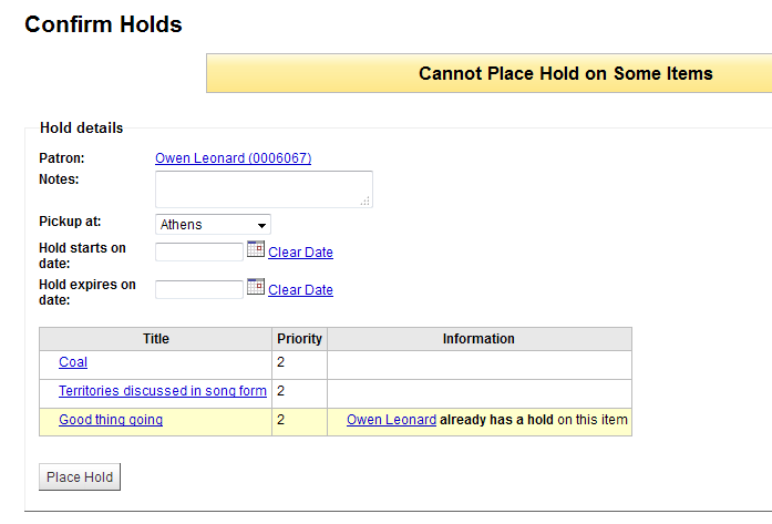 Created attachment 5104 [details] No patron name shows in error message Error should read "[Patron name] already has a hold on this item"