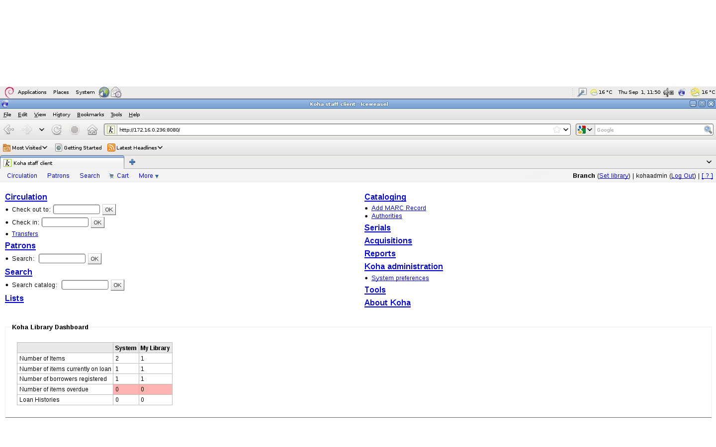 The Admin main page has a lot of empty space that could be utilised for library wide information. Other ILS show local and global information on various pages e.g. - Number of currently checked out items - Number of items in my branch - Number of overdues - Total Bibs catalogued in last 7 days. How about the addition of a Koha dashboard page to use this space and present local and global library information within the users context?
