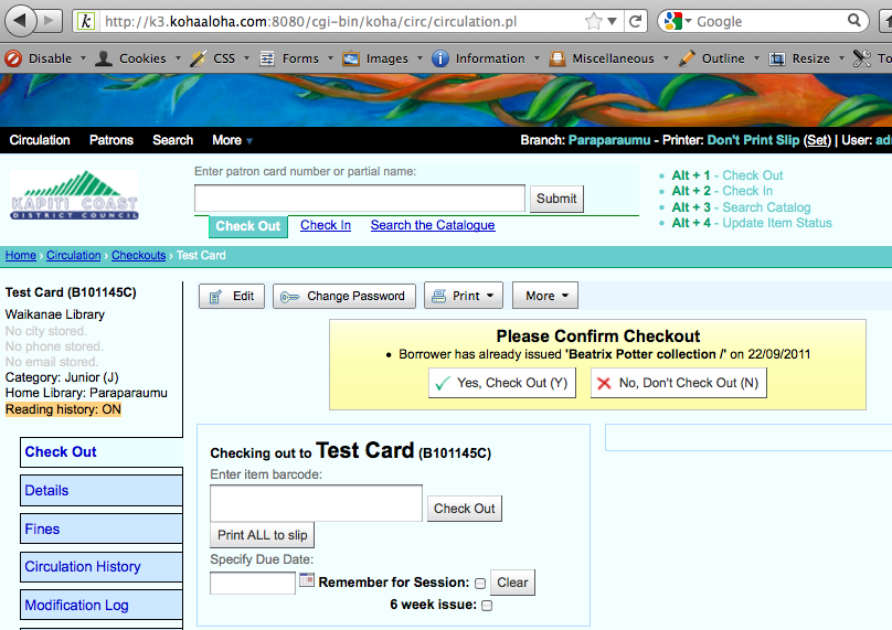 Created attachment 5533 [details] librarian attempts to issue a previously issued item... librarian attempts to issue a previously issued item, and a yes/no warning prompt is displayed