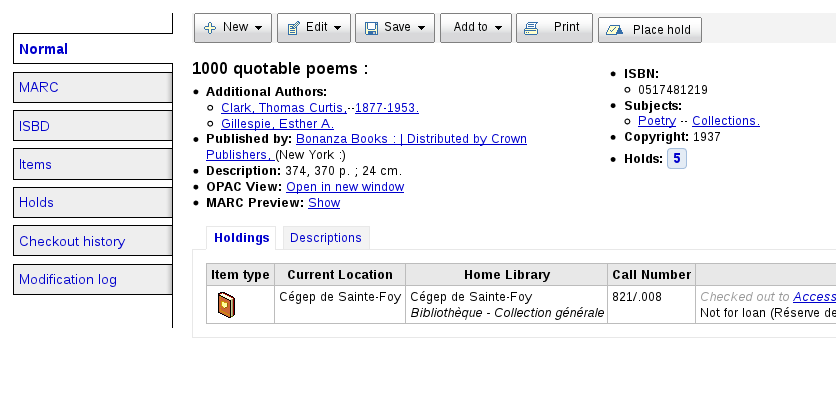 I'm not sure I understand what you mean about it not being in the biblio. Do you mean it shouldn't be mixed in with the info from the bib (like the title, author, subjects, etc)? If so, I'm okay with that - there is a MARC tab on the left and a labeled MARC tab over there too. So I'm okay with adding another tab for MARC - not sure what to call it, because right now the MARC and the Labeled MARC tabs both show Labeled MARC just slightly different .. hopefully Maxime has some ideas. Nicole