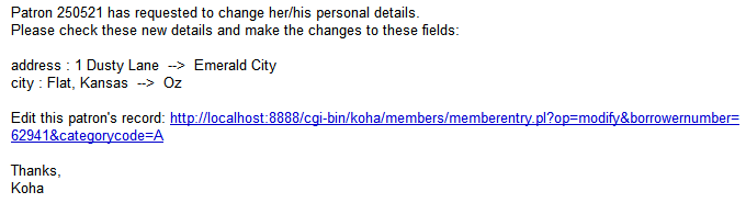When the patron fills in the form on the OPAC to edit their personal info it would be nice to highlight/mark the differences/changes. Currently we must manually compare every field in the email to their record to discover the changes they are requesting.