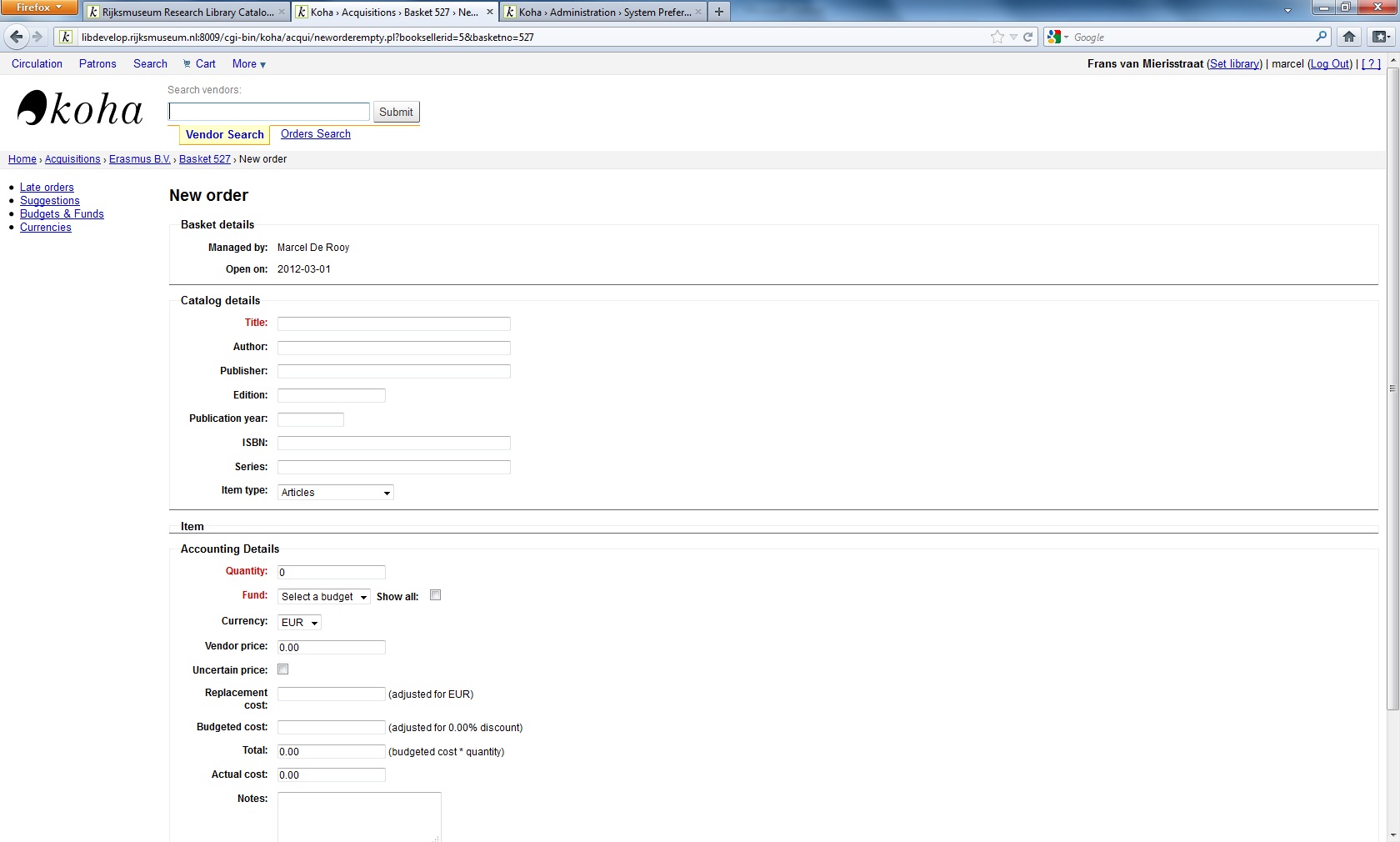 But still struggling with the 0 in quantity while having an item box (one item opened). Note that there is a javascript error (it is listed twice per call): Fout: document.getElementById("") is null Bronbestand: http://libdevelop.rijksmuseum.nl:8009/cgi-bin/koha/acqui/neworderempty.pl?booksellerid=5&basketno=527 Regel: 4 Cannot easily find this line, but could this be when it tries to update quantity but cannot find the element or so?