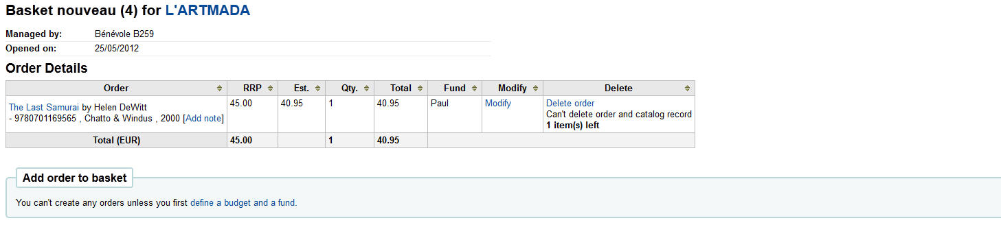 Test on a sandbox : - I create a budget with a owner and a user - I choose restriction = Owner and users - I log to koha with my authorised user : When i tried to go to a basket, there's no budget available : You can't create any orders unless you first define a budget and a fund. (cf attachments) two comments : 1. To add a new user to a budget, it doesn't work if this user have only 'order_manage' in permission : it will be nice to permit user to be added only to commande on this budget and not necesserly manage this budget. 2. On page : http://pro.test1.biblibre.com/cgi-bin/koha/acqui/acqui-home.pl in the table "All available funds for xxx library", in the column "fund", we expect to read the name of the budget not his number.