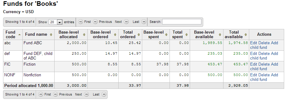Sorry Maurice for me not being clear. I took another look to admin/aqbudgets.pl and I found more confusing stuff, so I will try to make it clear what I think this table should look like to be really useful. I am looking at my production data. admin/aqbudgets.pl should have the following columns: Base-level allocated (or just Allocated) Base-level ordered Total sub-levels ordered Base-level spent Total sub-levels spent Base-level available Total sub-levels available Base-level is always calculated for one level, without children. Total sub-levels should include child funds. Available is calculated as "allocated - (ordered + spent)". So, this means that: - "Total allocated" should be removed because currently it shows the same data as "Base-level alloceted". - three new columns should be added: "Base-level ordered", "Total sub-levels ordered" and "Total sub-levels available"; - wording should be changed from "remaining" to "available" (consistency with acqui/acqui-home.pl)