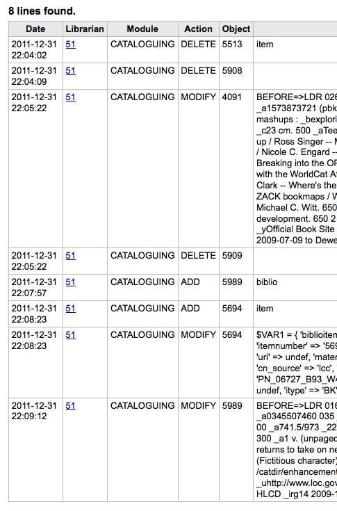 Created attachment 7052 [details] cataloging log I wasn't sure how to title this - view my screenshot. If you delete and item then 'item' is put in the info field so you know what was deleted, but if you delete a bib record it records the deletion, but not that it was a bib record.