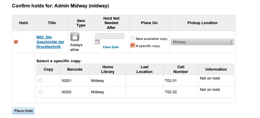 Created attachment 7101 [details] screenshot of detail page When placing item level holds the current status is not shown. It only shows 'not on hold' but should also show what is currently availalbe and what is checked out. To reproduce: 1) Make sure OPACItemHolds is activated 2) Place a hold in OPAC on a record with multiple items, some should be checked out 3) Select 'A specific copy' 4) Check list and try to determine which of the items are checked out