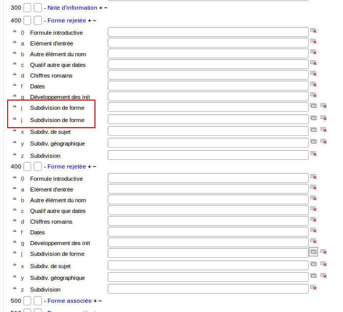 Plan to reproduce : 1) If we have a repeatable field (containing repeatable subfields) in an authority, let's repeat it at least once. 2) The first occurence will behave ok. But the following will function badly. If we clone a subfield from the second repeated field for example, the new subfield won't be created in the second field, but in the first one! In fact, any subfield cloned within any occurence of this field will be created in the first field on the list. (I'll attach screenshots)
