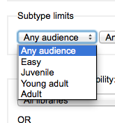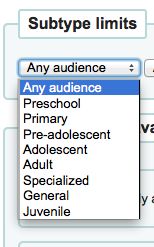 Further note: These subtype limits do not even match what the staff side or what is in the marc record (tag 008 position 22). In the OPAC: The subtype limit of Easy is audience 'a' which is Preschool audience on the staff side. The OPAC limit of Juvenile is actually 'c' Preadolescent on the staffside. (NOTE: there is a juvenile audience 'j' which leads to significant confusion by staff who believe this is the same search) Subtype limit of 'd' Young Adult on Opac is 'Adolescent' on staffside. Only the Adult designation is an accurate match to the search on the staffside.