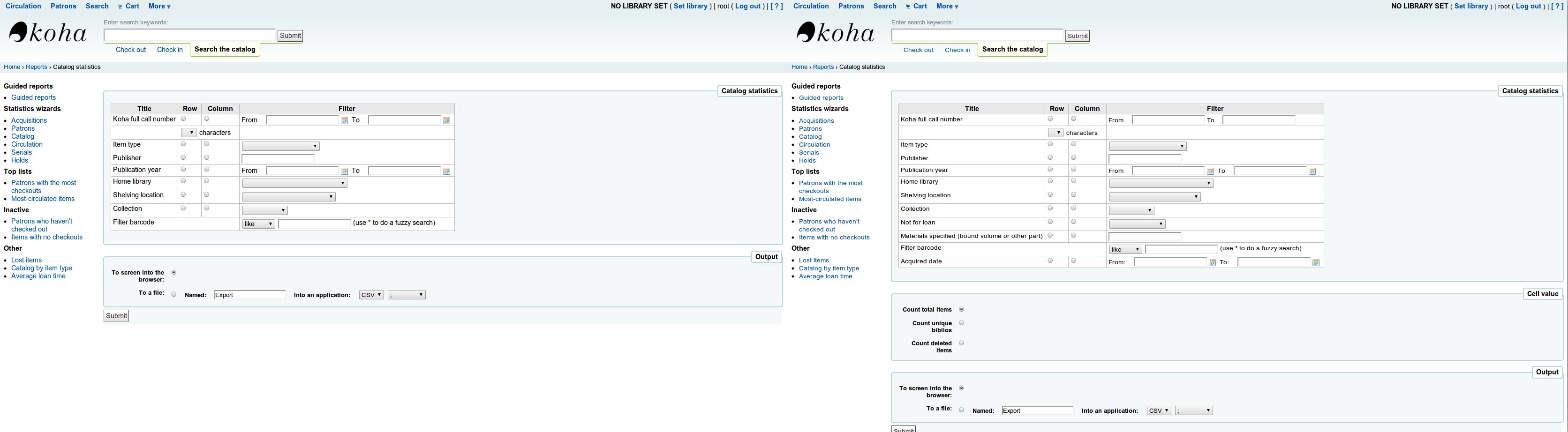 In the cataloguing wizard, add the following lines that can be used as row/column/filter: * status * item creation date (range with dynamic calendar) * item suppresion date (range with dynamic calendar) * origin : items.materials - authorized value list "origin" 995$s * Domaine : 995$t items.statisticvalue "domain" av list Adds options for distinct biblionumber count on title and items. Add 3 options (radio buttons) - Titles count "COUNT (biblionumber)" - Counting of copies "COUNT (ItemNumber)" (current behavior) - Counting of copies deleted "COUNT (deleteditems.itemnumber)" - Add to selected row or column + filter combo: - items.notforloan - items.materials - items.statisticvalue For each of these fields, retrieve the label and the code value allowed in the grid cataloging default. If no MARC field is mapped to the field in question, it does not show this line in the wizard. If the MARC field is associated with a legal value, it displays a dropdown list for the filter, if a text field. - Add to selected row or column + filter on a date range - Items.dateaccessioned (create Date) - Deleteditems.timestamp (date deleted) (Only if the third option (eg count. Del.) Is selected)