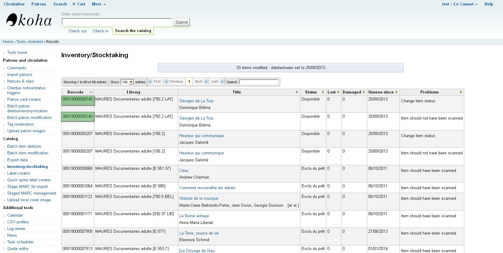 My first test. For the moment I only try to display a list of items and mark them seen, without comparing with a barcode file Trying to see all the items of a branch and location Before patch : - need to select XX items - in the resulting table : 5 columns "Seen", "Barcode", "Title", "Unseen since", "Problems" - the problem column contains the string "None" - no way to sort the table After the patch - no more need to select XX items : all the items are listed in a dynamic table with a pager - I checked the number of results, it is correct - the pager works fine - in the resulting table : 4 more columns : "Library", "Status", "Lost", "Damaged" - no column for type of document (at item level or biblio level) - no column for withdrawn status - column library contains the name of the branch, followed by the location and the callnumber into [] : "BU En Magasin [130593/5/1]" - status contains the "translated" value of coded status : "Empruntable" for item for loan - columns are sortable. it works well - column "problem" is void. but the "none" message was useless 3 buttons on bottom of table : Mark seen and Quit, Mark seen and Continue, Continue without marking On 1st page of results, I check 2 items and click on "Mark seen and Continue". The pager shows me automaticaly the 2d page. I click on 2 more items I click on "Mark seen and Quit" I am redirected to the home page of inventory. No message confirming me that 4 items were marked seen I made a report to confirm that : the 4 items were marked seen Same test, but checking "export to csv" : data well exported (encoded in iso 8859 and not in unicode). I can see the same informations as in screen display (but 3 columns for library - location - callnumber) => OK Same test, but using the filters in inventory home page on "items.notforloan", " items.itemlost", "items.withdrawn", "items.damaged" Only the items matching my filter criteria are displayed on screen or exported to csv => OK Same test, but only showing callnumber between XA and Z (my callnumber are like A 000, A 002 .... B 001, B 002 ... Z 999) Only callnumbers begining with XA->XG are displayed => OK for this kind of callnumbers Same test, but only showing callnumber between 130593/5/1 and 166026/1962/2 (my callnumber are numeric, sometimes with a slash after the main number) 0 results => KO for this kind of callnumbers ===== It looks better than before, but - why not a column on "withdrawn" status, as it is one of the possible filters? - wot sure the callnumber filter is working well. Could you remind me when the column "Problem" is supposed to show something? I haven't try to compare the results with a file of barcode yet. Mathieu