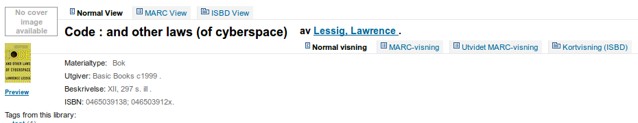 Created attachment 8232 [details] Screenshot showing double tabs When marcflavour = NORMARC OPACXSLTDetailsDisplay = use XSLT the detail view has a double set of tabs for different views of the MARC record - see attached screenshot.