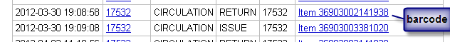 Created attachment 8761 [details] [review] Replace itemnumber by barcode in links of patron modification log For the common user the itemnumber is of rather small interest. The main and immediate way to identify an item is the barcode. So, it would be more convenient and rapid, when they may analyse a problem from a patron circulation log, to have the barcode displayed instead of the itemnumber in the ISSUE and RETURN links. This patch just do it.