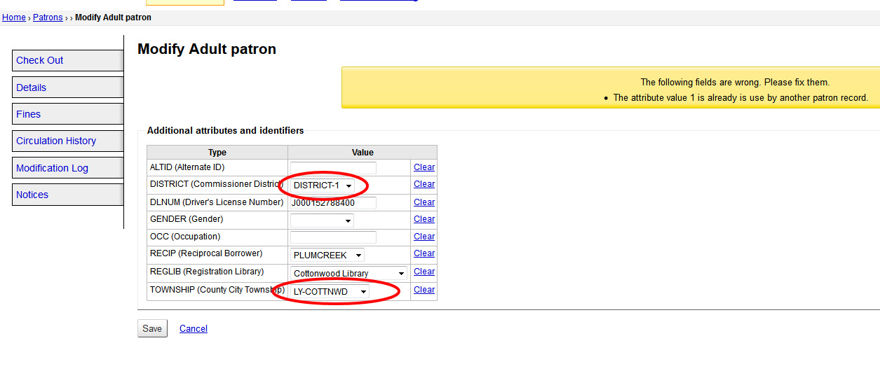 Created attachment 9125 [details] attribute error When you have an attribute set to unique you get an error when trying to save the patron record, but it mentions an attribute number and that number is not visible anywhere in the staff client so it's confusing the librarian entering the data what field they entered the wrong info in to. See attached (ignore the circled fields - the Driver's License is the unique field here.