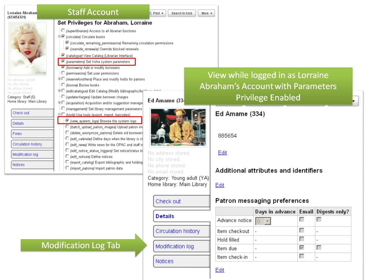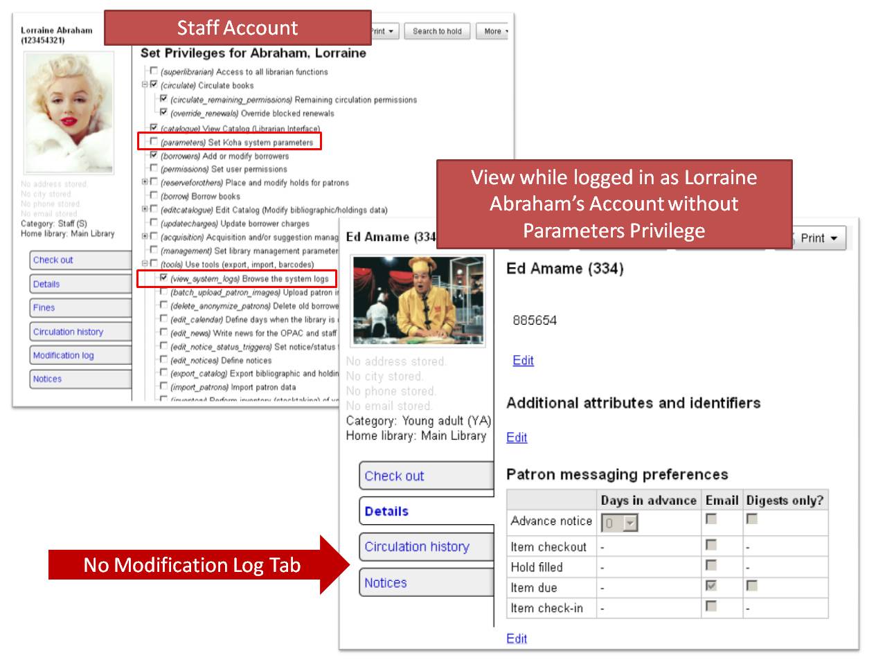 Created attachment 9274 [details] without parameters permission See attached. The "Modification Log" tab does not appear while viewing a patron's record (Detail, Check Out) unless the staff member has the "Set Koha system parameters" priviledge enabled.