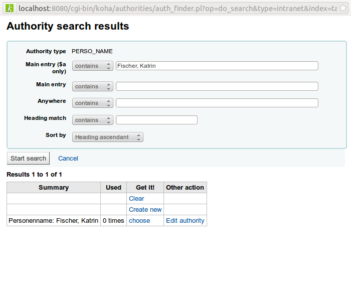 This works nicely, but with one caveat: The link is only shown on a result list of authority records. This means you have to find authority records you don't want to use first. I would like the link to also show when no authority records have been found for a search. If you got results, 2 links show in the first 2 lines of the result list. Clear Create new (see screenshot) I never before noticed the "Clear" link and I am not sure what this is used for. It seems to close the window and leave the fields empty. But maybe there is more to it? Both links seem a bit misplaced as separate lines in the table. I would have expected them to show up separately, maybe above the table as buttons/links. "choose" should be capitalized. This is still a big improvement compared to the current workflow, so signing off.