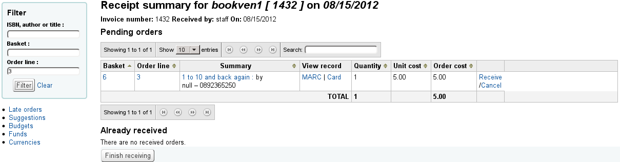 Hello wajasu, sorry if I was not clear for the test, your snapshots are useful to explain: 1° without patch: if you look at the first snapshot you see a column without title on the right of 'Order cost' column, this column have Receive/Cancel, two explicit links. But if you click on Cancel, this link doesn't cancel the order. That is the bug. 2° with the patch: we can see on your second snapshot we have now two columns, the second one offers the same choice than the normal page without filter, I mean 'Delete order' and depending on the situation of the biblio record, 'Delete order and catalog record' or 'Can't delete...' in our case. And of course if you click on the link 'Delete...' it does its job, no more bug. I hope I am clear, so the first check of my patch is when you look at your snapshots (the right column(s)) changes, and the second is to try to cancel an order without my patch (it doesn't cancel) and with my patch (cancel successful). So thx for re testing wajasu.