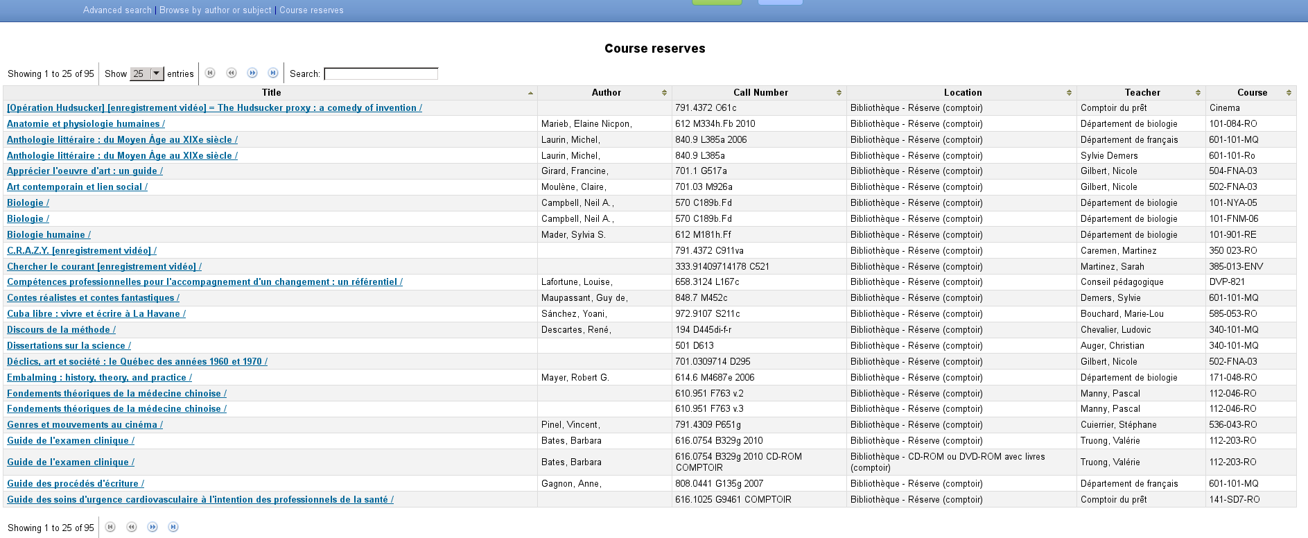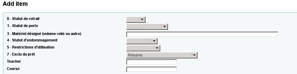 New functionnality to add a status Reserved for the Not For Loan field of items. It also adds fields to add the name of the Teacher and the Course. It adds a new page in the OPAC to list all the items that have this status. The functionnality looks like what is in bug #8215, but it's much more simple. It was also one of the first features I added to koha, so it really lacks comments, isn't based on master (based on 3.8.2) and doesn't have database updates yet. I'm posting it here to see if there's any interest and to have feedback on how I did the functionnality. Thanks.