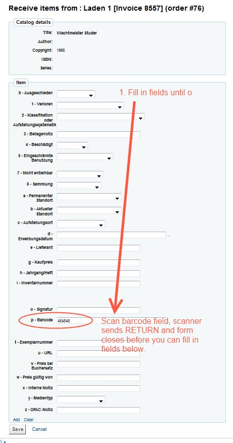 Created attachment 13749 [details] Screenshot unwanted return while adding item during receiving process 1) Set syspref 'AcqCreateItem' to 'Create Item when receiving an order.' 2) Create a basket for a vendor, add an order line. 3) Search for this vendor using Vendor search 4) Receive Shipment for this vendor and choose the title you ordered in 2) 5) You will get the dialog to create related item(s) 6) Fill in Item 0 through o (see screenshot) 7) Scan Barcode for field p - Barcode 7) Result: Scanner sends a [return], form closes and you had no chance to fill in fields t - z