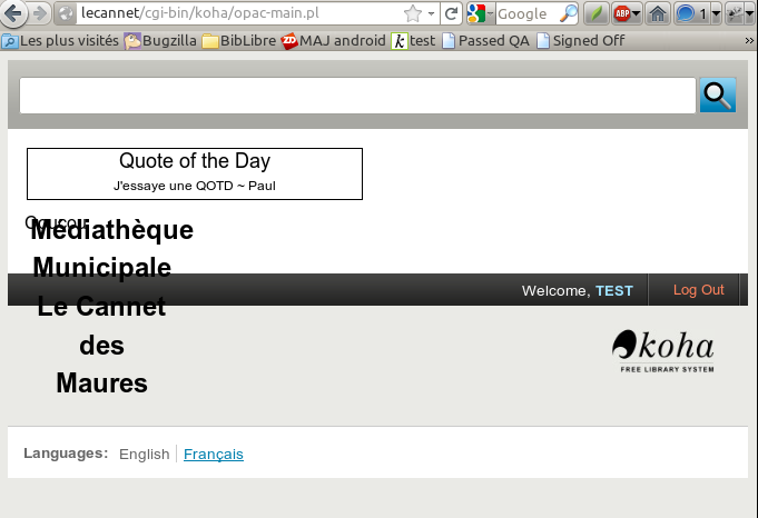 (In reply to comment #63) > Paul, > > It looks like the last patch did not make it into master. Could you please > push it when you get a chance so that the ccsr theme will work? Last patch pushed, I don't know what I made to miss that ! (probably because those patches have duplicate encoding UTF-8 header, so I had to apply them one by one after removing the duplicate line. (In reply to comment #61) > masthead.inc has non-English text: > > <p><a href="/cgi-bin/koha/opac-main.pl" title="Accueil"> Accueil </a> > [% IF ( searchdesc ) %]<span class="rsaquo"> › </span><a > href="/cgi-bin/koha/opac-search.pl" title="rechercher"> Recherche > </a><span class="rsaquo"> › </span> Yikes ! As I speak french, there are some french data (like LibraryName, OpacNav,...) so I didn't spotted those french strings in the middle of english ;-) I've pushed a fix for that too