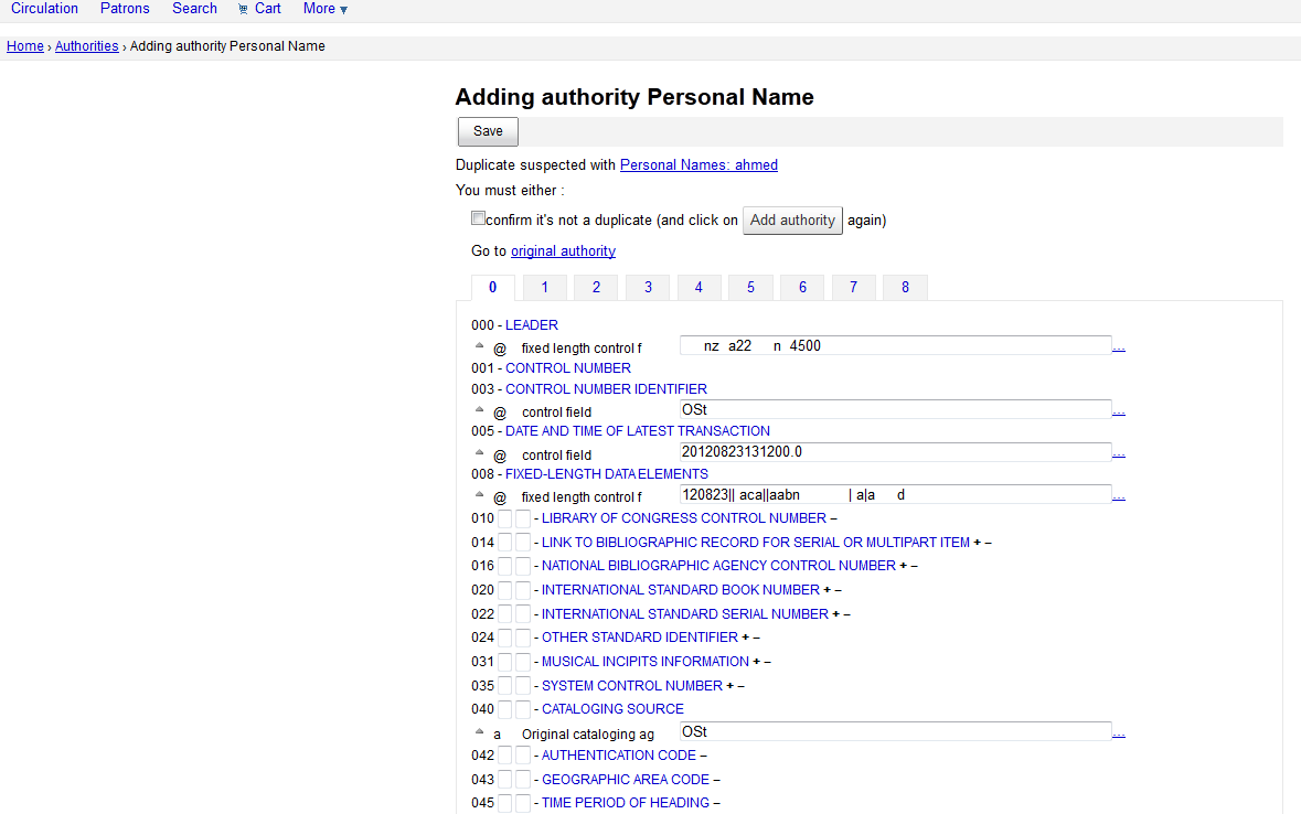 Created attachment 11773 [details] duplicate authority error i tried to create new authority with no data [as a testing case] when i click on save i got an error to enter the mandatory fields then i click again on save i get "duplicate authority record :ahmed" although i don't have an authority record "ahmed..... [i searched for it in authorities i get results so i deleted them all .... i still get results for authority "ahmed " but i when i click on "Details" i get "record doesn't exist " ] Attached a screen shot showing this problem Also, when i try to return to the original authority by clicking on "original authority" i got an error >>> 2nd attachment shows this issue.