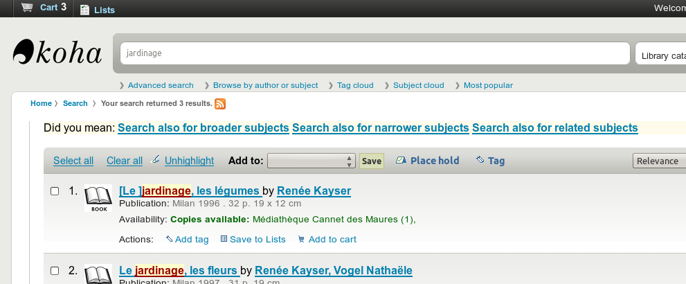 Created attachment 12186 [details] [review] Bug 8726: ExplodedTerms suggestion plugin When working with hierarchical subject headings, it is sometimes helpful to do a search for all records with a specific subject, plus broader/narrower/related subjects. This patch adds a suggestion plugin for these "exploded" subject searches to Koha. Note that this patch depends on both bug 8211 AND bug 8209. To test (NOTE: this test plan covers both 8211 and 8726): 1) Make sure you have a bunch of hierarchical subjects. I created geographical subjects for "Arizona," "United States," and "Phoenix," and linked them together using 551s, and made sure I had a half dozen records linking to each (but not all to all three). 2) Do a search for su-br:Arizona (or choose "Subject and broader terms" on the advanced search screen with "more options" displayed), and check that you get the records with the subject "Arizona" and the records with the subject "United States" 3) Do a search for su-na:Arizona (or choose "Subject and narrower terms" on the advanced search screen with "more options" displayed), and check that you get the records with the subject "Arizona" and the records with the subject "Phoenix" 4) Do a search for su-rl:Arizona (or choose "Subject and related terms" on the advanced search screen with "more options" displayed), and check that you get the records with the subject "Arizona," the records with the subject "United States," and the records with the subject "Phoenix" 5) Ensure that other searches still work (keyword, subject, ccl, whatever) 6) Use "Did you mean?" page in admin section to enable ExplodedTerms plugin 7) Do a keyword search on the OPAC, confirm that searching for exploded terms is suggested. 8) Do a subject search on the OPAC, confirm that searching for exploded terms is suggested. 9) Do a non-keyword, non-subject search on the OPAC, confirm that searching for exploded terms is NOT suggested. 10) Disable ExplodedTerms plugin and enable AuthorityFile plugin. 11) Do search on OPAC, confirm suggestions are made from authority file. 12) Sign off Signed-off-by: wajasu <matted-34813@mypacks.net> Note that you will need to shift-refresh in order to get the new Javascript after the latest update to jQueryUI.