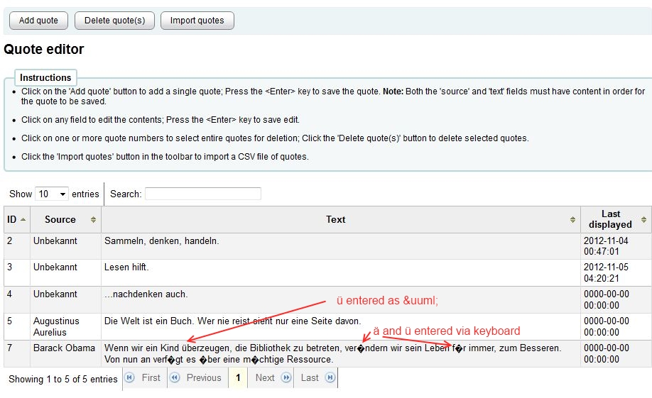Set to higher importance because the bug leads to data corruption in the table quotes (while editing, the wrongly encoded strings are stored back to the database).