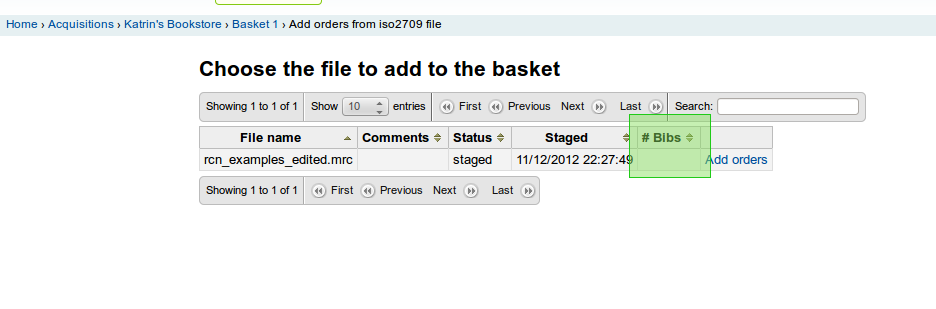 Created attachment 13409 [details] screenshot When ordering from a staged file in acquisitions, the column '# Bibs' in the table is empty for my staged file with 17 records.