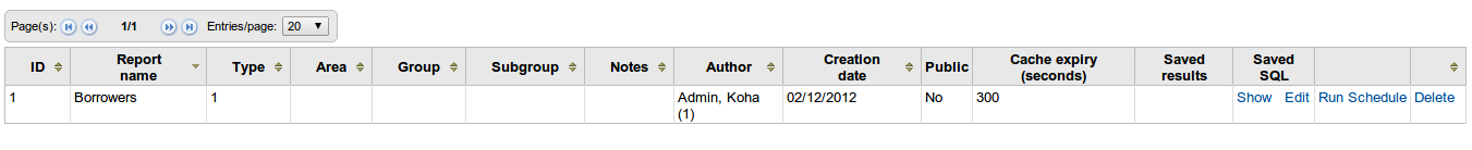 Before applying this patch, I tested on master and found that the following columns in reports are sortable: Report ID, Report Name, Type, Area, Group, Subgroup, Saved SQL, and the two furthest columns to the right, which are unlabeled. The following columns are NOT sortable: Notes, Author, Creation Date, Public, Saved Results. After applying the patch, I found that the following columns are now sortable: Report ID, Report Name, Type, Area, Group, Subgroup, Notes, Author, Creation Date. The following columns are now NOT sortable: Saved SQL, and the two further columns to the right which are unlabeled. This makes sense, and the column sorting appears to work correctly. I'm signing off!