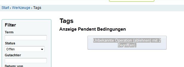 Created attachment 14013 [details] Error while rejecting tag in translated staff client (German) Rejecting tags results in message: Unbekannte Operation (ablehnen) mit 2 Begriff(en). Steps to reproduce: 1) Go to Home › Tools › Tags 2) Filter tags to show a list of tags. Check checkboxes of tags you want to reject. Click "Reject" at the bottom Result in English staff client: "Rejected 1 Term(s). " Result in German Staff client: "Unbekannte Operation (ablehnen) mit 1 Begriff(en)." (Unknown operation (ablehnen)...) Same with approve. I tested on a 3.9 demo server, German translation installed. Can somebody confirm for newer version and for other languages?