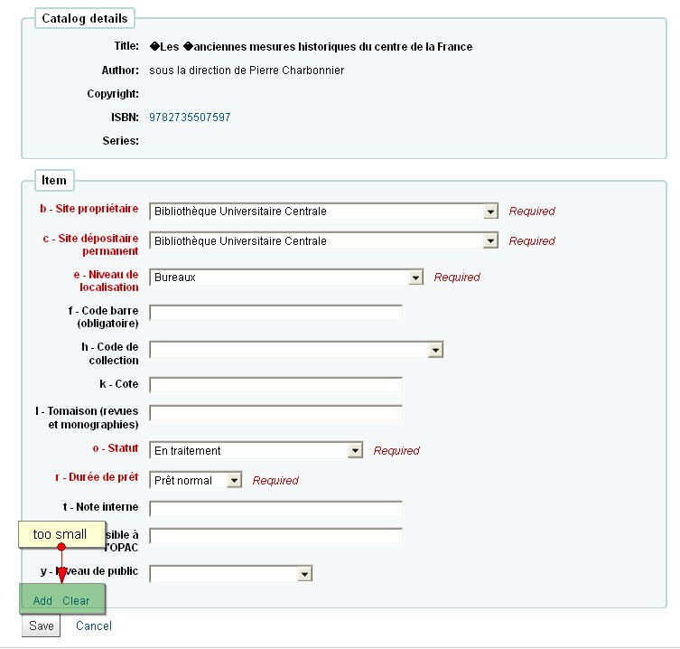 If you create items when you receive documents, you must click on "Add" at the bottom of the each item block. Very often, librarians don't see the "Add" and "Clear" links and just click on "Save" button at the end of the form So, it would improve Koha usability to make "Add" and "Clear" more visible. M. Saby Rennes 2 University