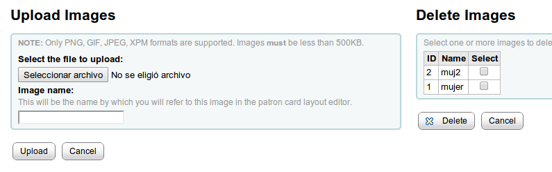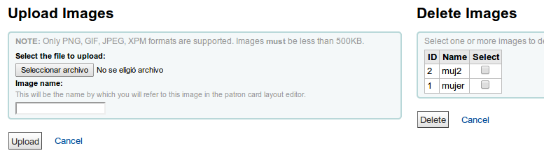 Created attachment 15829 [details] [review] [PASSED QA] Bug 9693 - Remove YUI styling from buttons on the patron card creator's image manage page Buttons on the patron card creator's image manage page are styled using YUI. They can be classified as submit buttons rather than toolbar buttons, so they should have default submit button styles. This patch removes YUI styling and related JavaScript. Other minor changes: Markup corrections for validity. To test, view the patron card creator's image manage page. "Upload" and "Delete" buttons should look correct and work correctly. Upload and delete operations should function normally. Signed-off-by: Bernardo Gonzalez Kriegel <bgkriegel@gmail.com> Comment: Work as described. No errors. Questions answered in comments. Signed-off-by: Katrin Fischer <Katrin.Fischer.83@web.de> Works nicely and is more consistent.