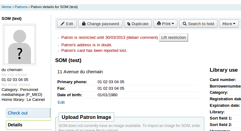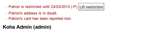 In a patron detail page (moremember.pl), when looking at a patron with one or more flags, for example : . Patron is restricted until 30/03/2013 (debarr comment) . Patron's address is in doubt. . Patron's card has been reported lost. Click on Check out tab and look at circulation page : flags are red. It is more attractive for librarian.