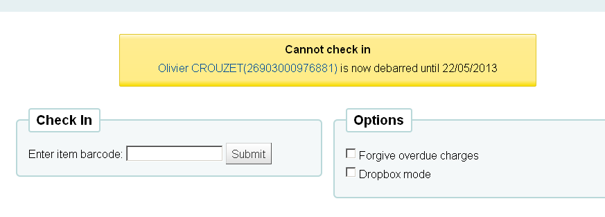 Created attachment 16458 [details] cannot check in When a late document is checked in, every thing works as it should (the check in is correctly recorded) except that the warning box displays, in addition to the usual restriction applied to patron, an extra and inappropriate heading 'Cannot check in'. (cf joined image).